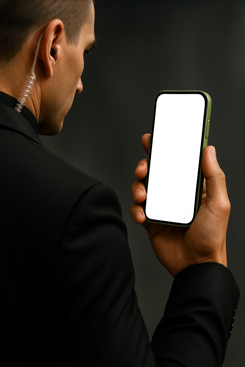 A vigilant security guard dressed in black holds a green phone with a blank screen. The image captures the guard from behind, emphasizing his watchful demeanor.