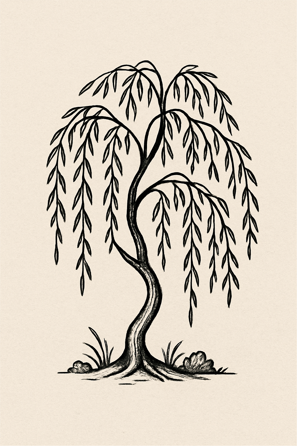 A detailed illustration of a weeping willow tree, showcasing elegant curves and drooping branches. Ideal for nature-themed decor or botanical art.