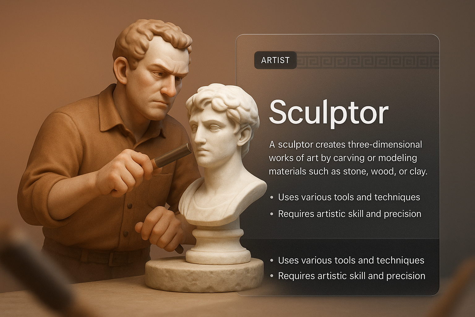 This image showcases a sculptor meticulously carving a bust, with a transparent overlay containing descriptive text about sculpting techniques and skills. The layered composition enhances the 3D effect.