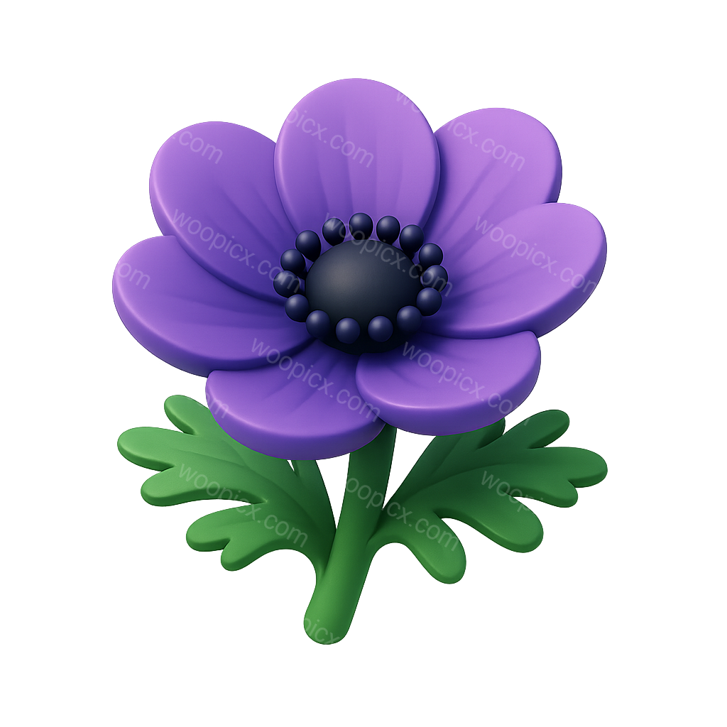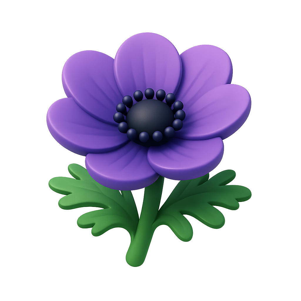 A stylized 3D rendering of an anemone flower, featuring vibrant purple petals and a black center. The design includes green leaves, set against a softly glowing background.