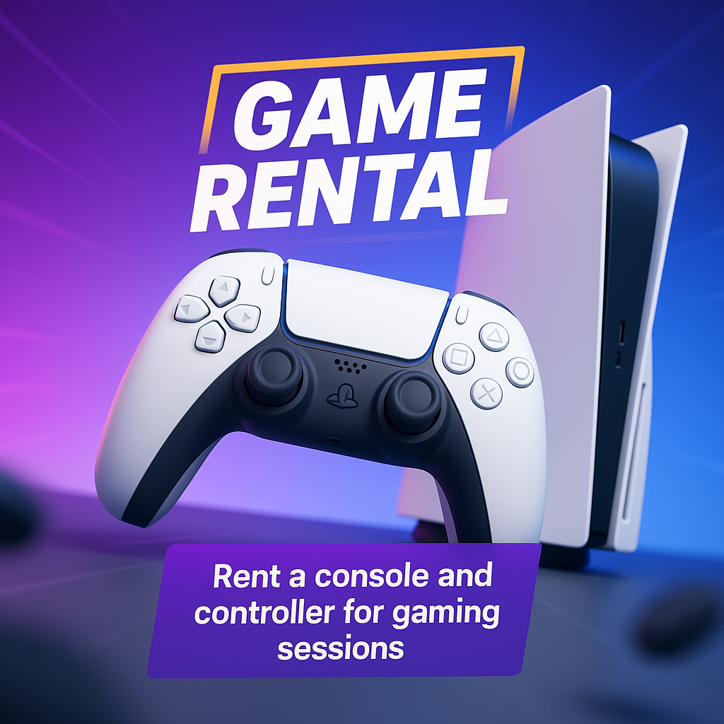 Promotional Gaming Rental Graphic Featuring Console and Controller