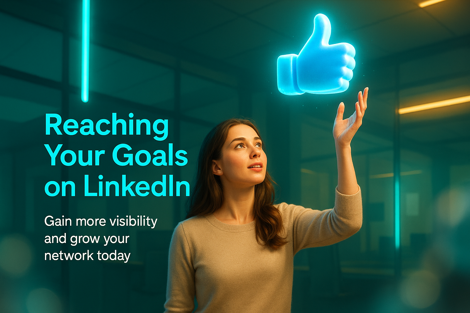 Engaging promotional image for LinkedIn featuring a woman interacting with a glowing thumbs-up icon, ideal for social media marketing and career development.