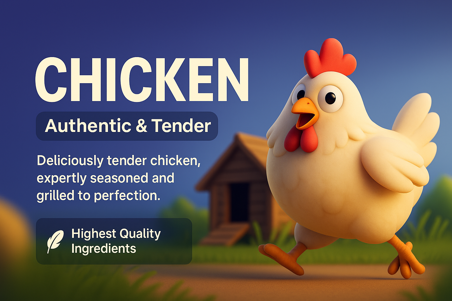A vibrant 3D illustration of a chicken, showcasing its authentic and tender appeal. The background features a smooth gradient, while the chicken is dynamic and engaging.