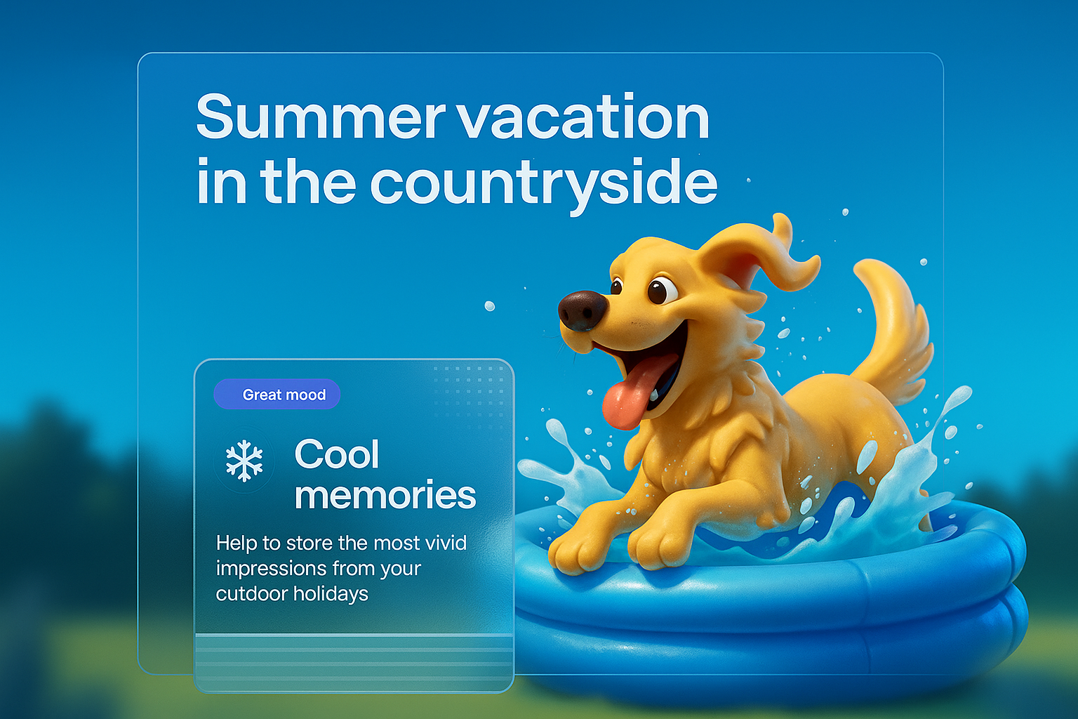 /Collection: /by davooda/Type: PNG/A cheerful dog joyfully splashes in an inflatable pool, embodying the essence of summer vacation in the countryside. The vibrant scene captures the joy of outdoor fun.