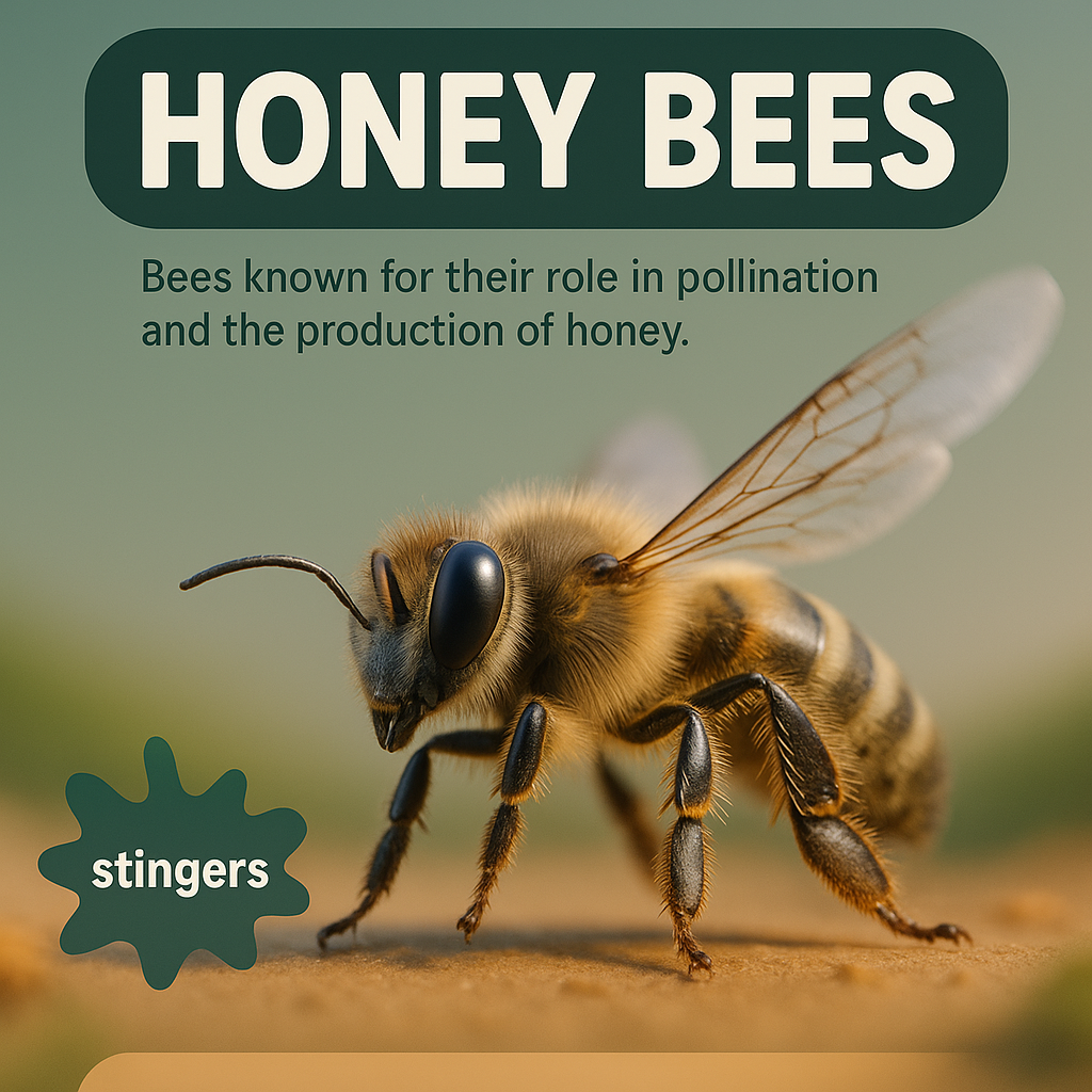 /Collection: /by davooda/Type: PNG/This is an informative graphic showcasing honey bees, emphasizing their role in pollination and honey production. The design is vibrant and engaging, suitable for educational purposes.