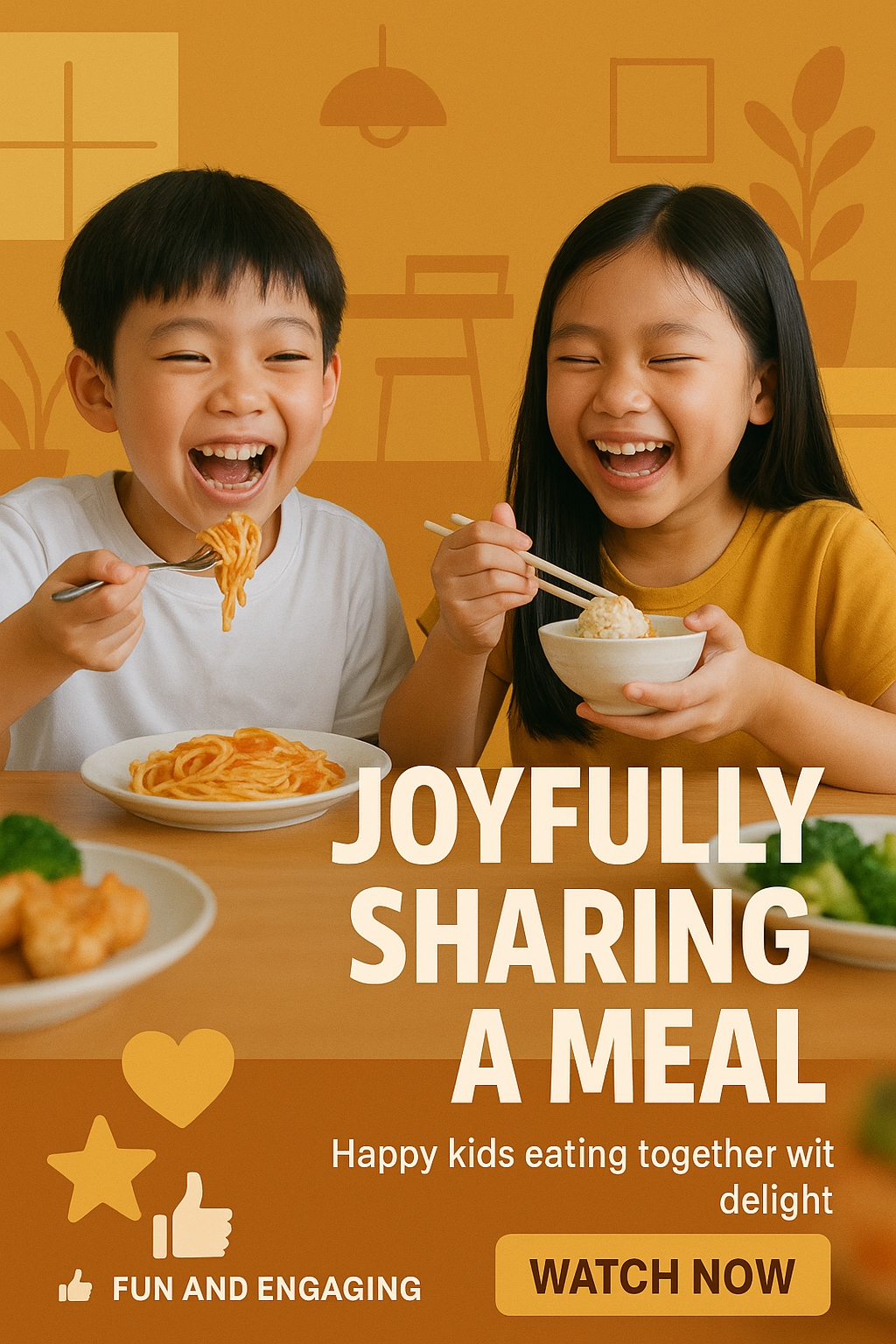 /Collection: /by davooda/Type: PNG/Vibrant social media post showcasing joyful children enjoying a meal together, designed to evoke warmth and engagement, ideal for family-oriented content.