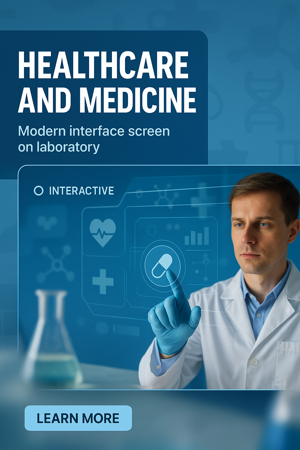 /Collection: /by davooda/Type: PNG/A modern graphic showcasing a healthcare professional interacting with a digital interface in a laboratory environment. Ideal for medical technology marketing.