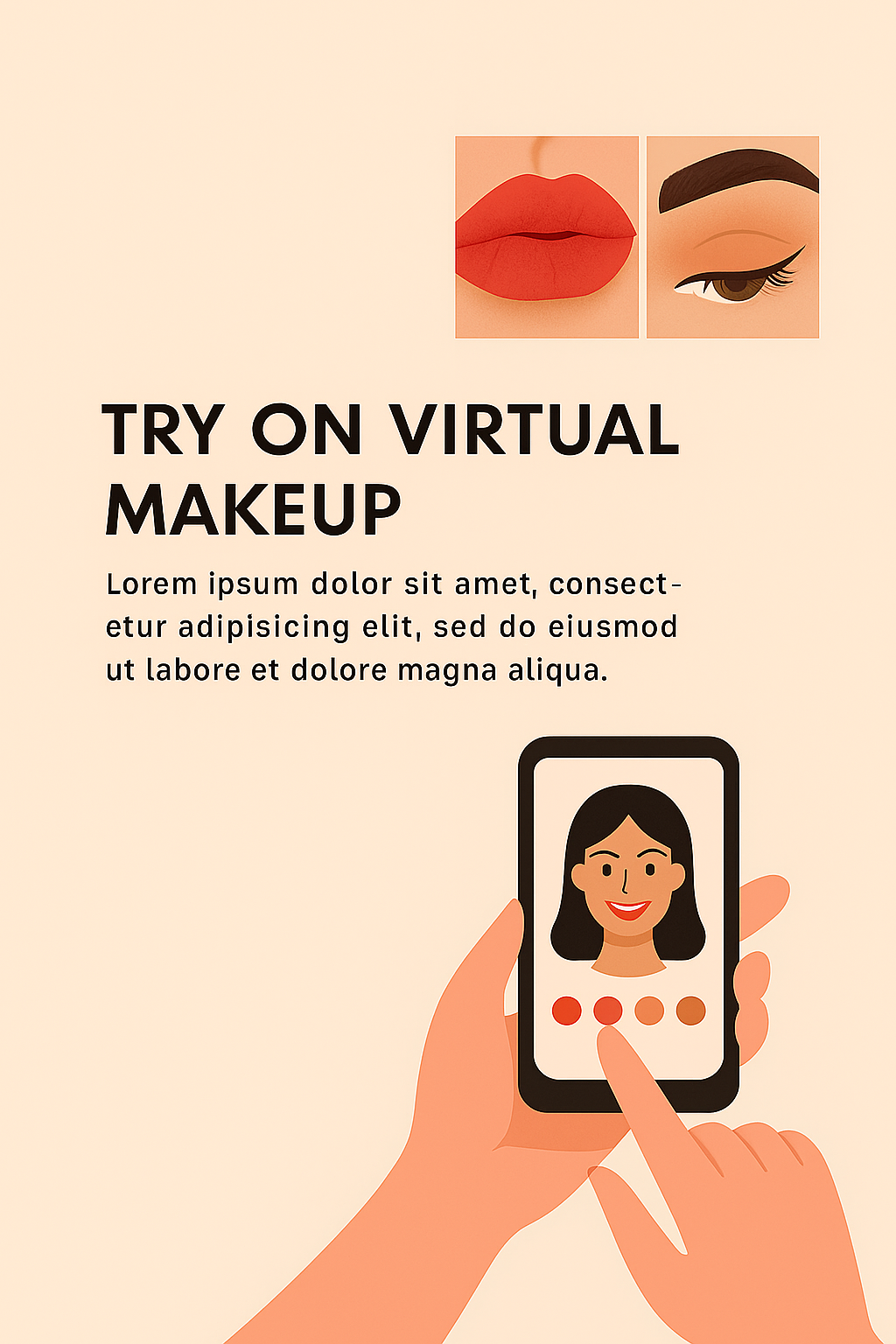 Engaging promotional graphic for a virtual makeup application, featuring a mobile phone interface displaying makeup options. Designed with modern illustrations and a clean layout, ideal for beauty brands and apps.