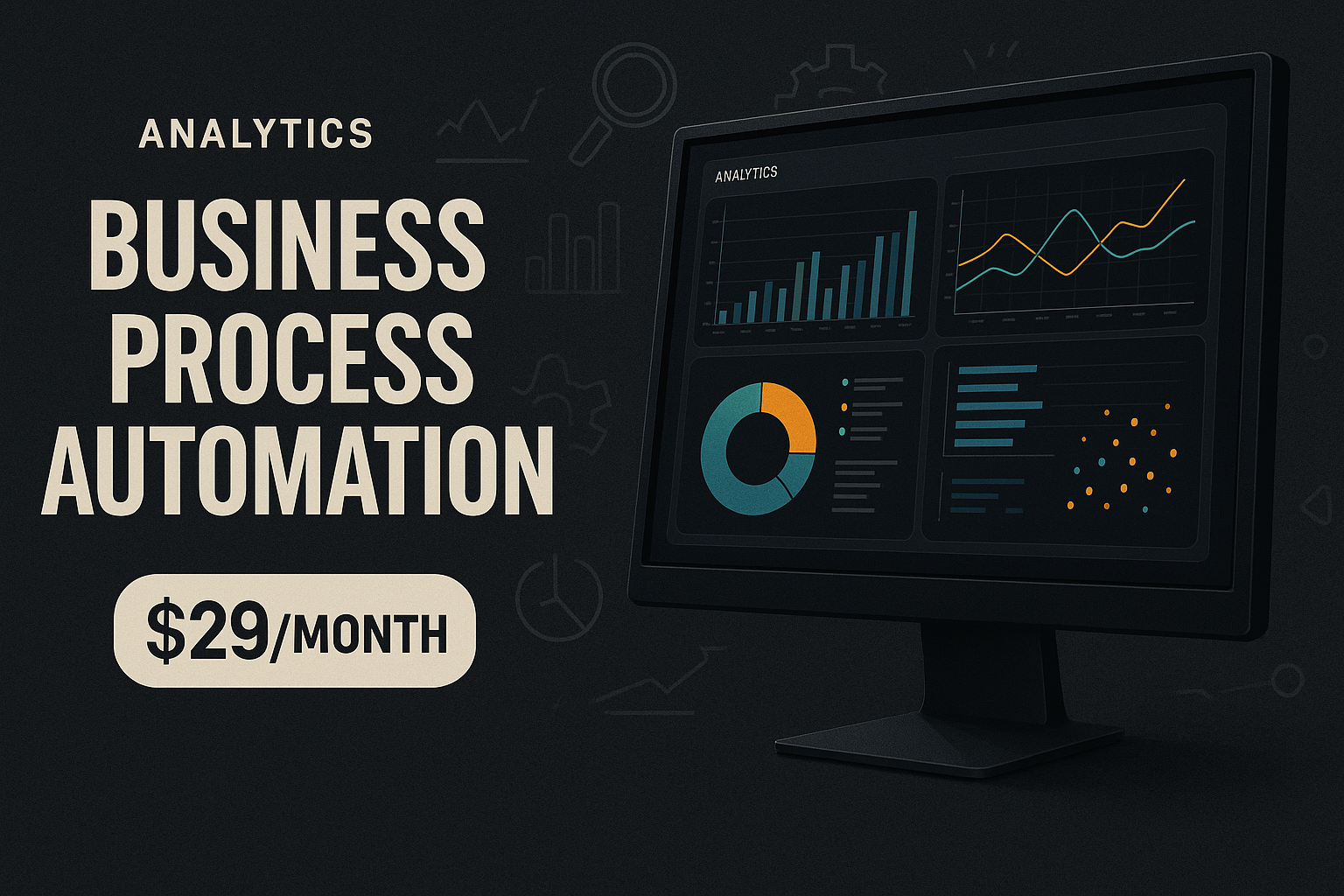 /Collection: /by davooda/Type: PNG/A modern advertisement showcasing a computer monitor displaying dynamic data analytics. The design features bold typography, a dark background with light texture, and a clean layout emphasizing business process automation.