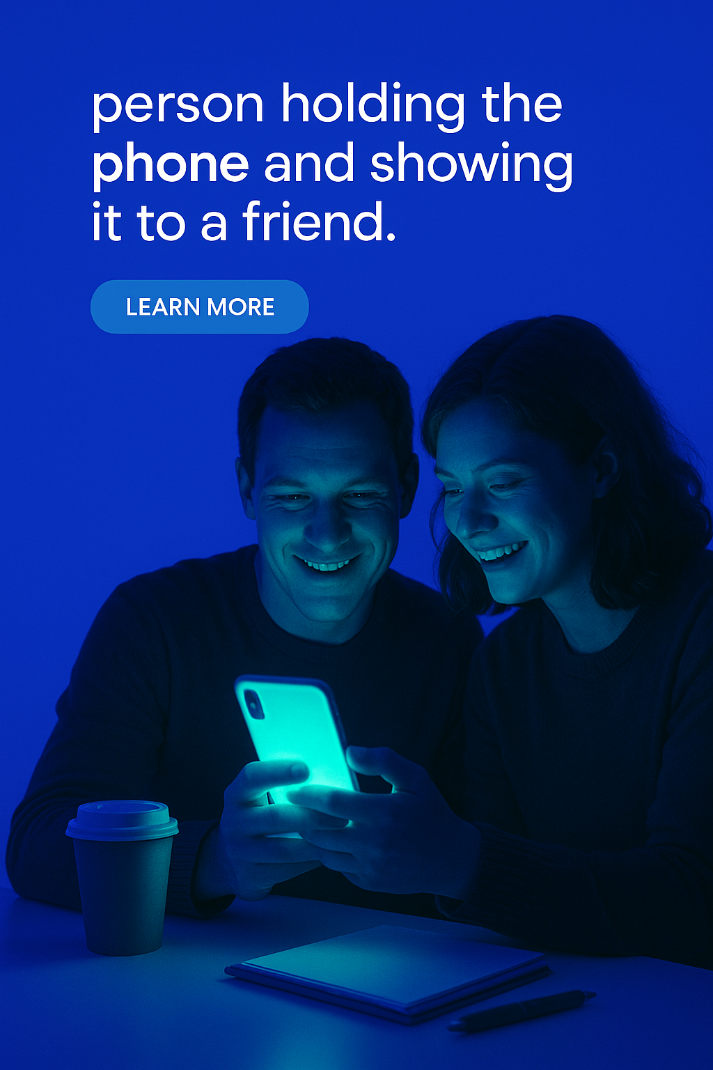 /Collection: /by davooda/Type: PNG/A person showing a glowing phone to a friend, set against a blue backdrop. The glow from the phone illuminates their faces, creating a vibrant atmosphere full of cool shades.