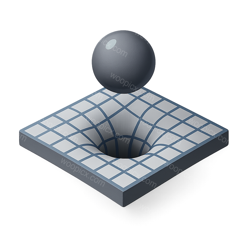 A 3D representation of a spacetime curve, featuring a black sphere above a grid-like, concave surface. The icon is designed with a transparent background and an isometric perspective.