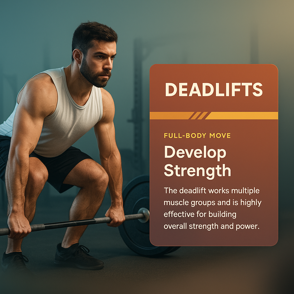 /Collection: /by davooda/Type: PNG/A visually appealing landing page design featuring a man performing deadlifts. The design includes a gradient background, a prominent feature block with engaging text and graphics about deadlifts.