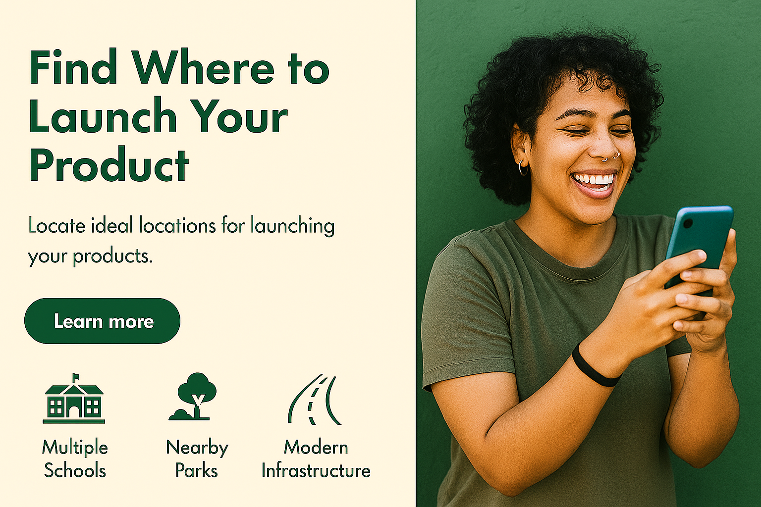 Engaging promotional graphic highlighting ideal locations for product launches, featuring a smiling individual with a smartphone. Designed for marketing purposes.