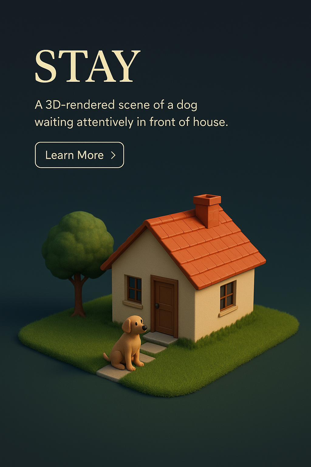 A detailed 3D-rendered scene featuring a dog waiting in front of a cozy house, set against a dark gradient background. The scene captures a small-scale environment with vibrant colors.