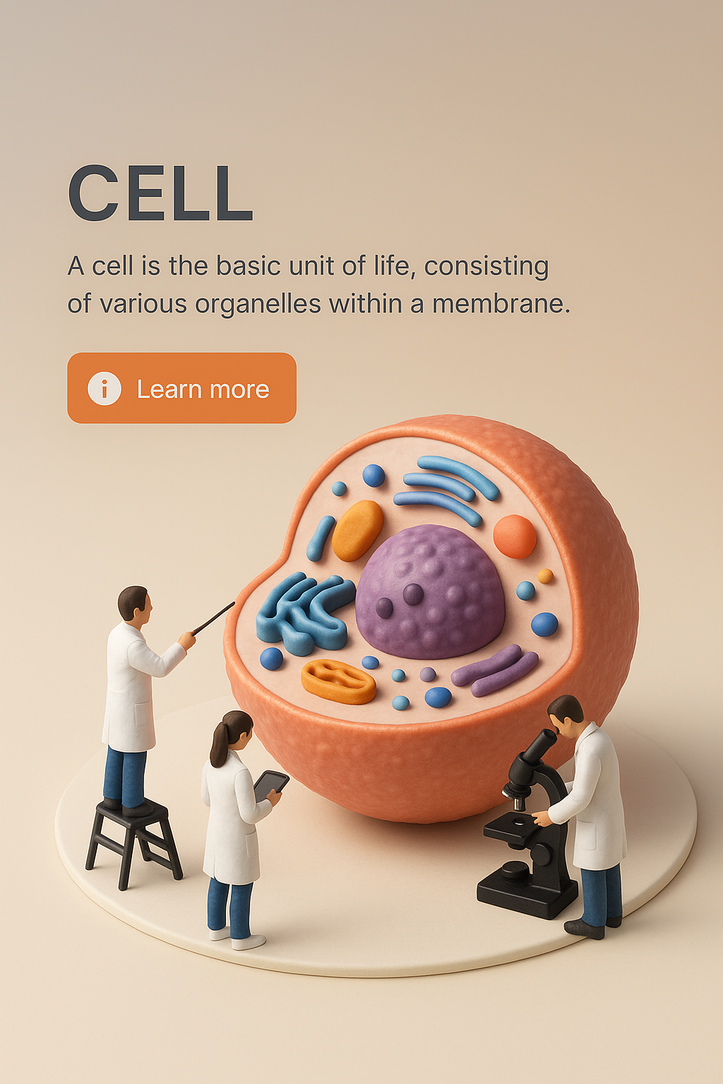 A realistic 3D illustration of a cell showcasing various organelles. Small scientists interact with the cell, emphasizing its structure in a zoomed-out perspective.