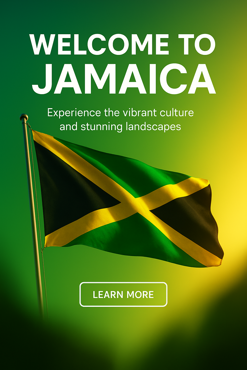 A visually striking banner showcasing the Jamaican flag, emphasizing the country's culture and landscapes. Ideal for travel promotions and tourism marketing.