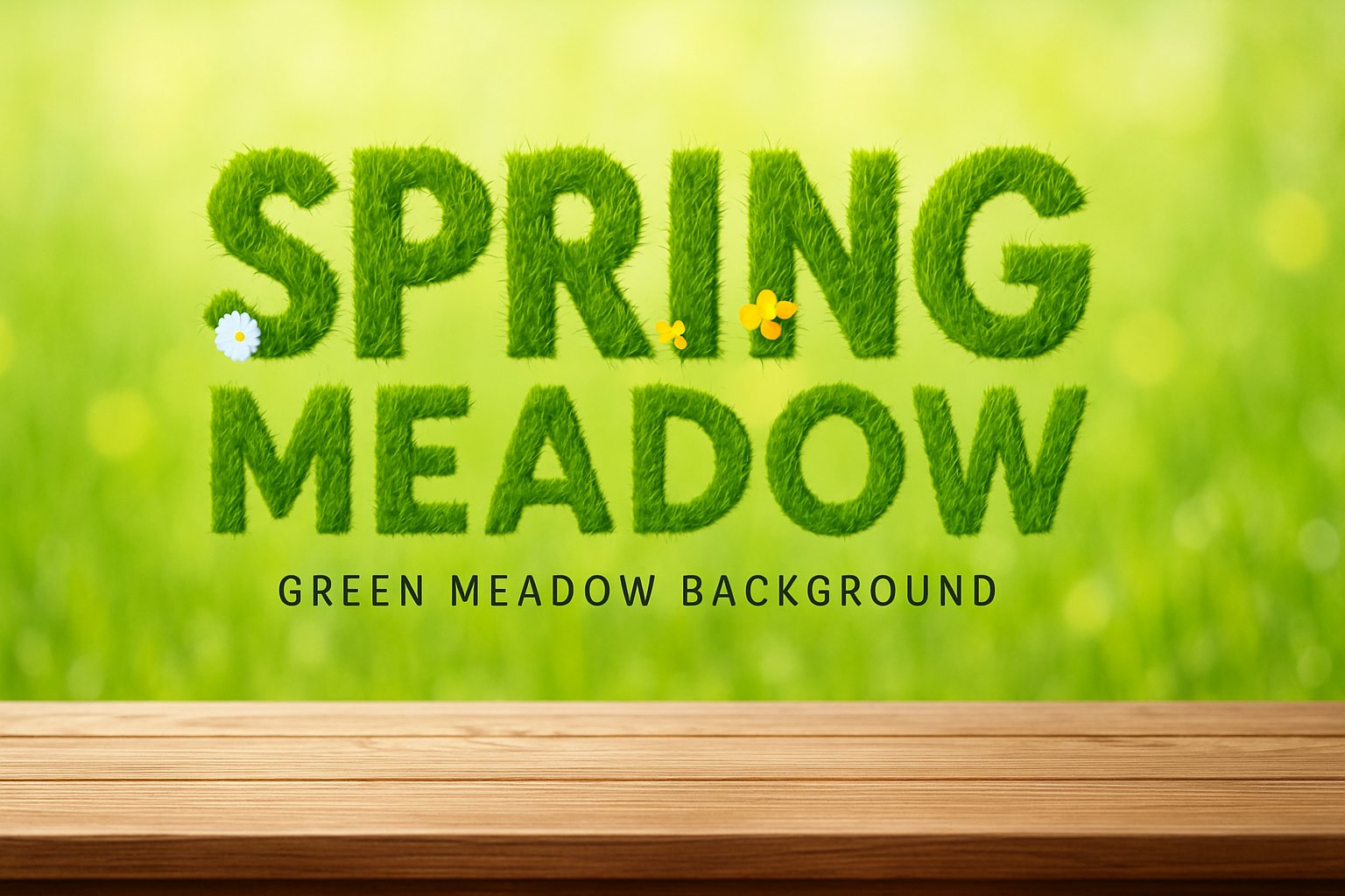 A bright and cheerful graphic featuring the phrase 'Spring Meadow' styled in green grass typography against a soft-focus meadow background, ideal for seasonal promotions or nature-themed projects.