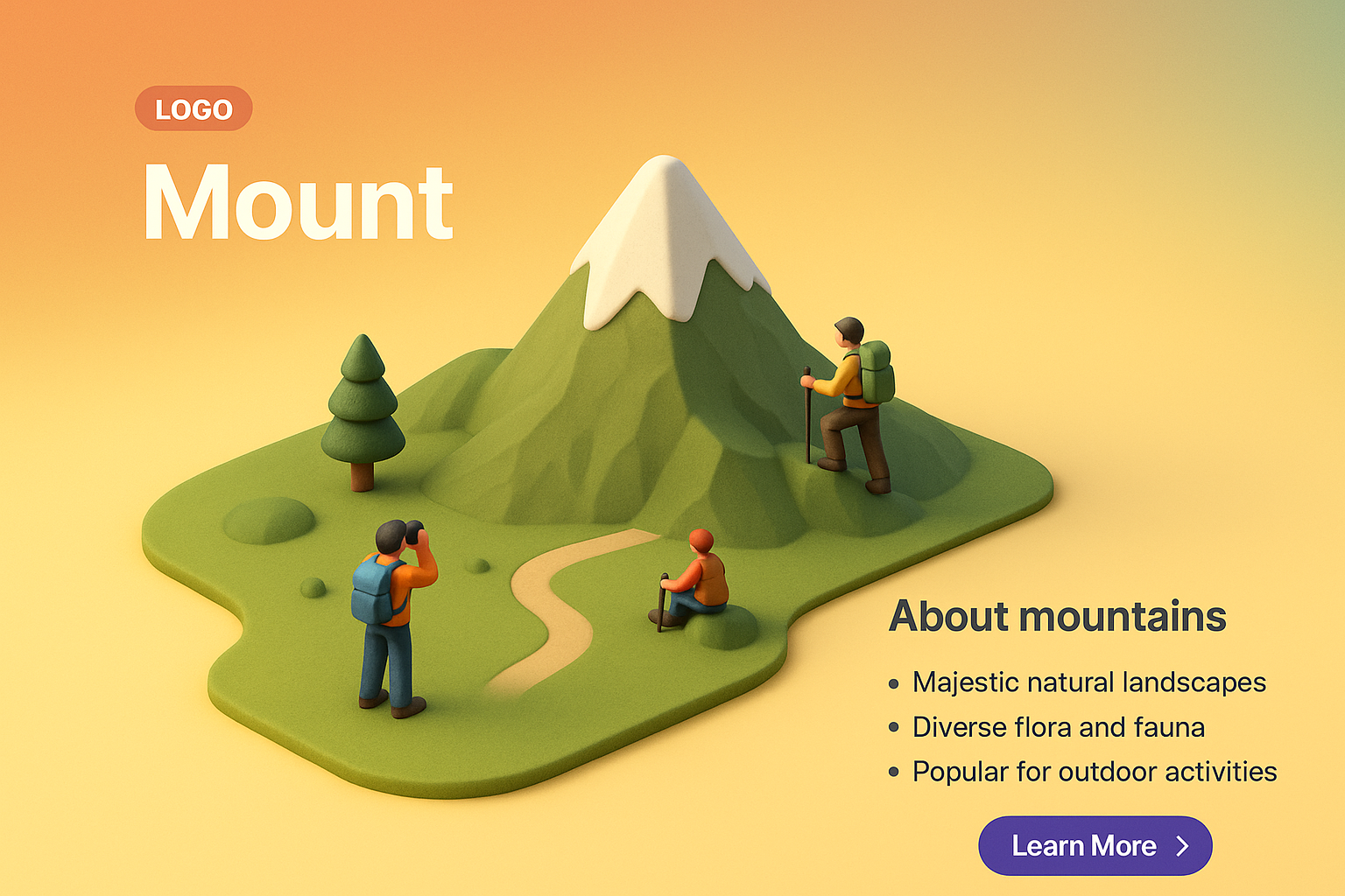 A vibrant 3D illustration depicting a mountain with hikers, surrounded by trees and a winding path. The scene showcases outdoor activities with a smooth gradient background.
