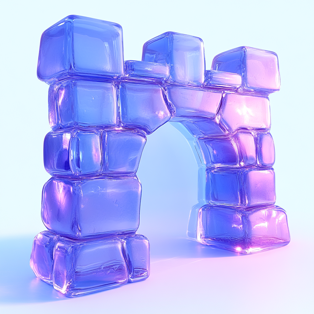 A stylized 3D rendering of an ice castle archway made from translucent ice blocks, featuring a gradient of purple hues. Ideal for fantasy or winter-themed designs.
