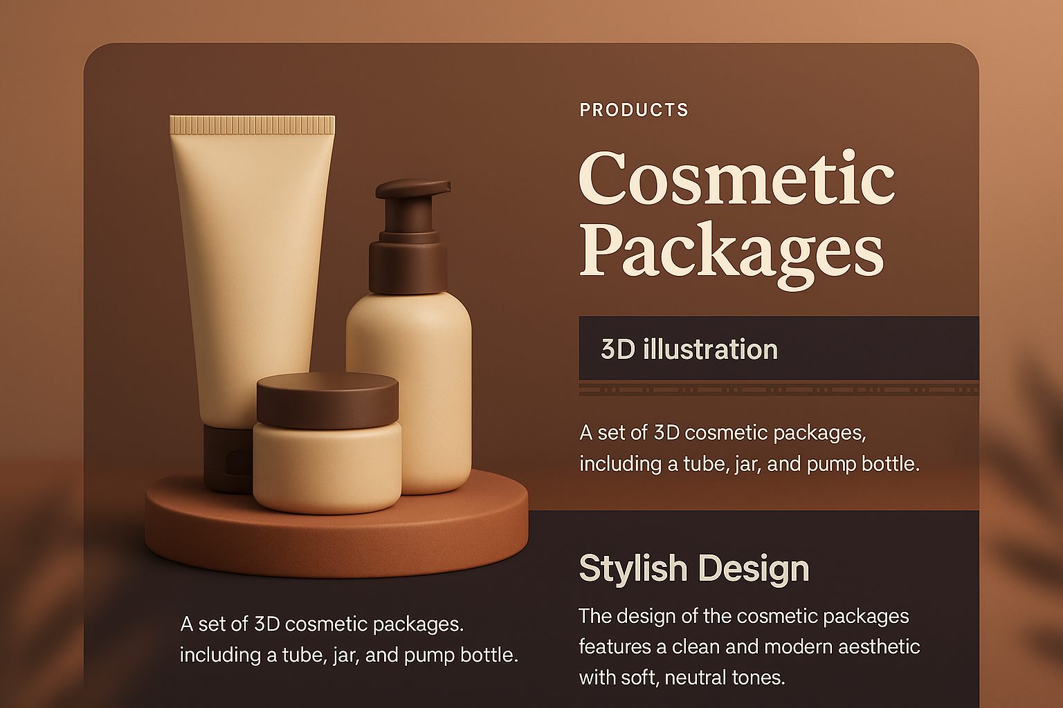 /Collection: /by davooda/Type: PNG/A visually appealing set of three 3D cosmetic packages featuring a tube, jar, and pump bottle arranged on a circular base. The design emphasizes a modern aesthetic with neutral tones and a smooth gradient background.