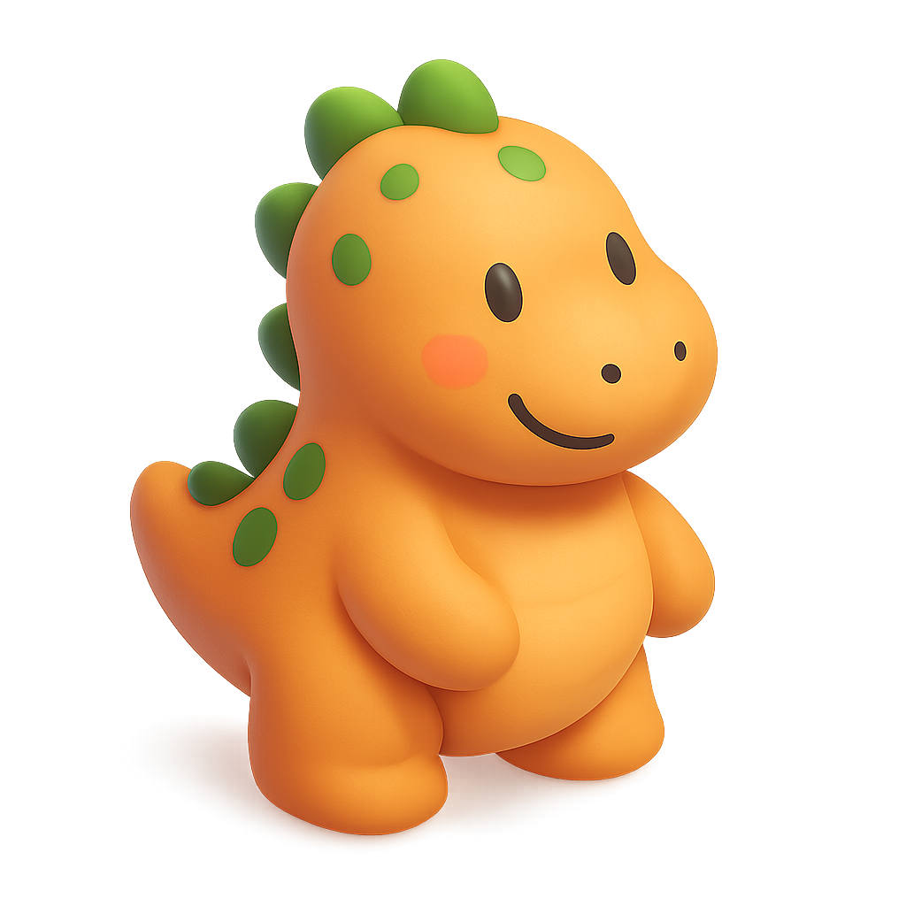 A charming 3D isometric icon of a cute orange dinosaur with green spikes and a friendly smile, designed with a transparent background and a volumetric feel.