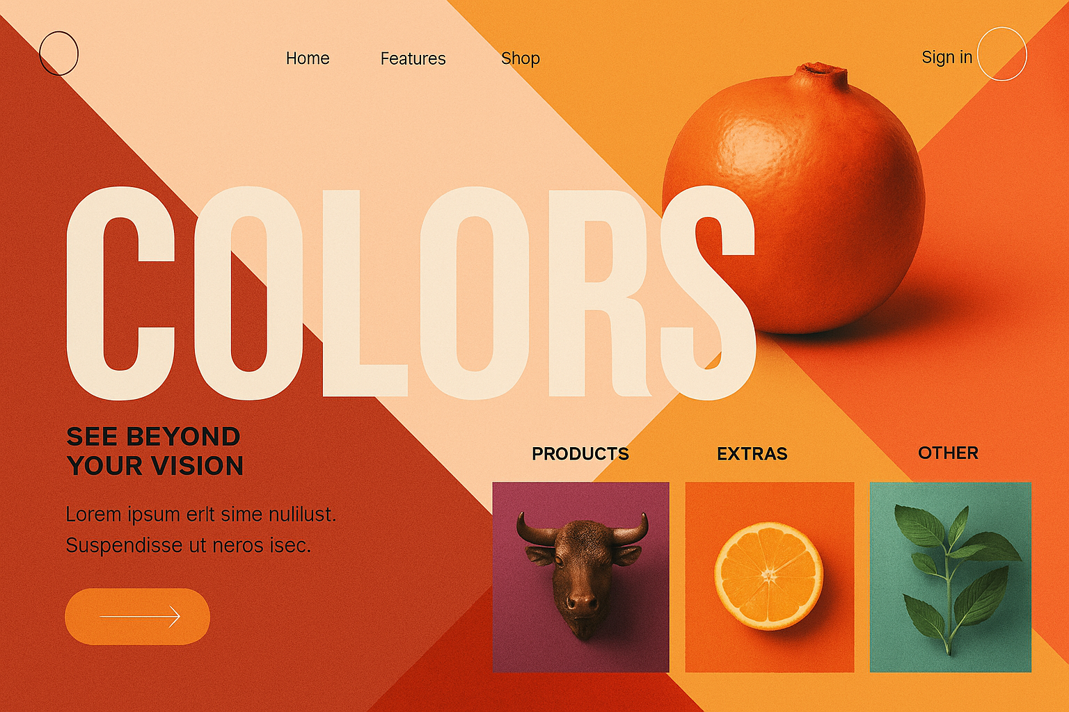 /Collection: /by davooda/Type: PNG/This image showcases a modern landing page design featuring vibrant color blocks, geometric shapes, and hyper-realistic objects. The layout emphasizes bold typography and minimalistic elements.