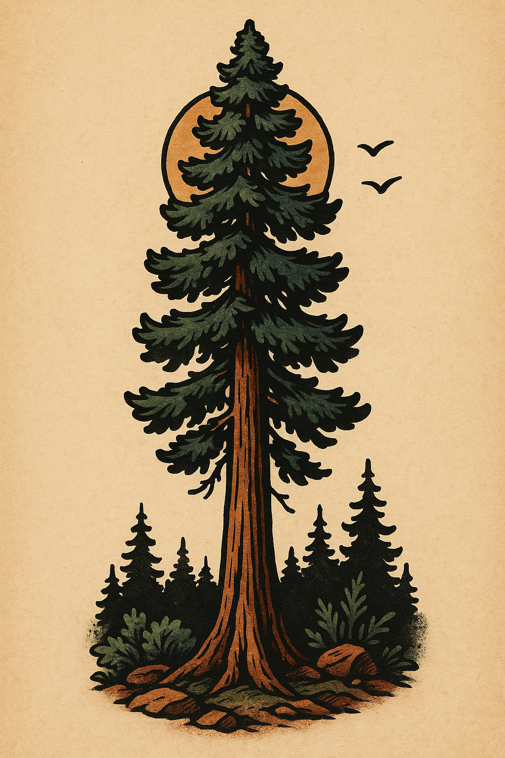 /Collection: /by davooda/Type: PNG/This is a stylized illustration of a tall tree against a sunset, featuring earthy tones and surrounding vegetation. Ideal for nature-themed decor or eco-friendly branding.