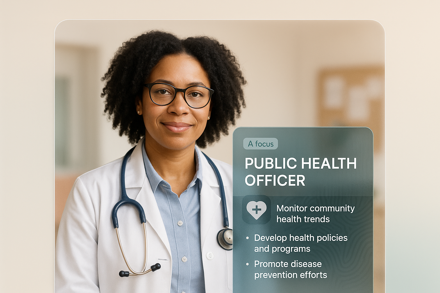 A professional public health officer is depicted, wearing a white coat and stethoscope, with a soft gradient background. The design includes a text block with health policies and a cohesive layout.