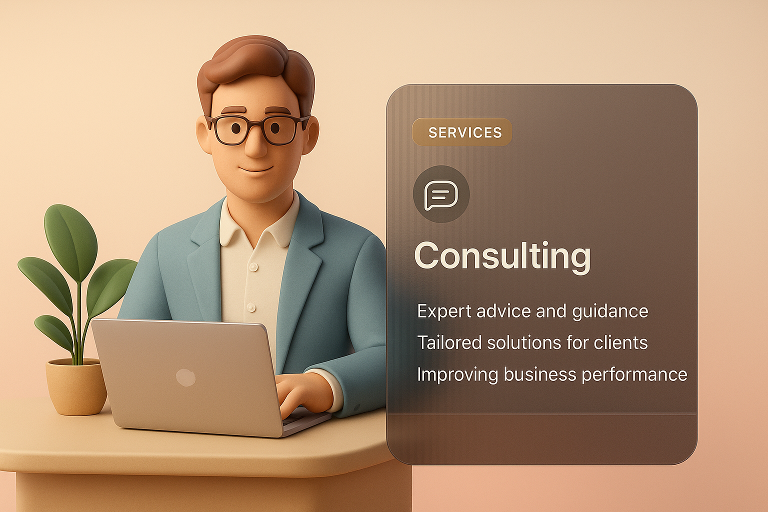 /Collection: /by davooda/Type: PNG/A 3D rendered image of a consultant working on a laptop, featuring a light gradient background, a stylish text block with a dark overlay, and a plant accent. The design emphasizes clarity and modernity.
