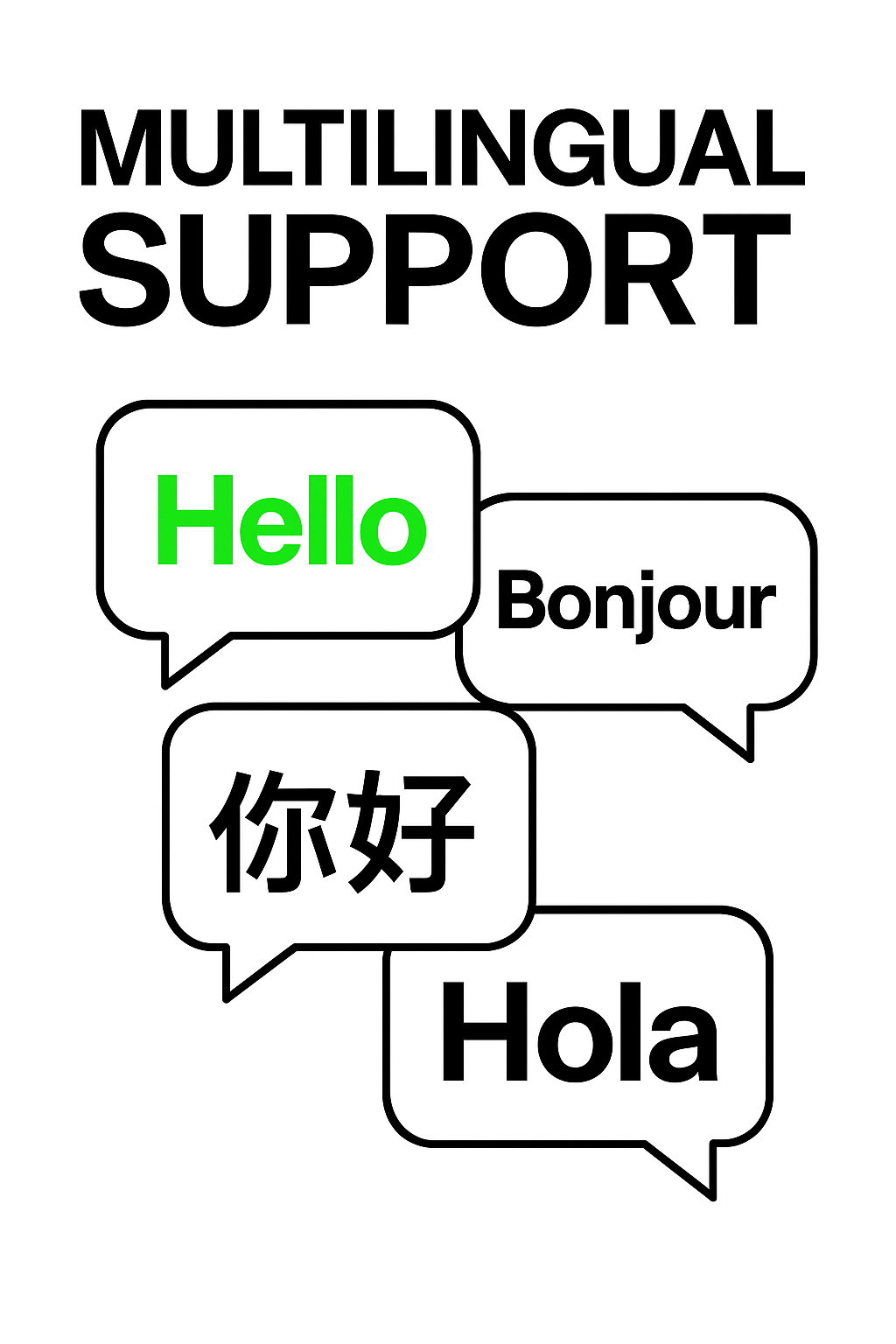 A promotional graphic emphasizing multilingual support with speech bubbles in various languages. The modern design is ideal for tech or customer support marketing.