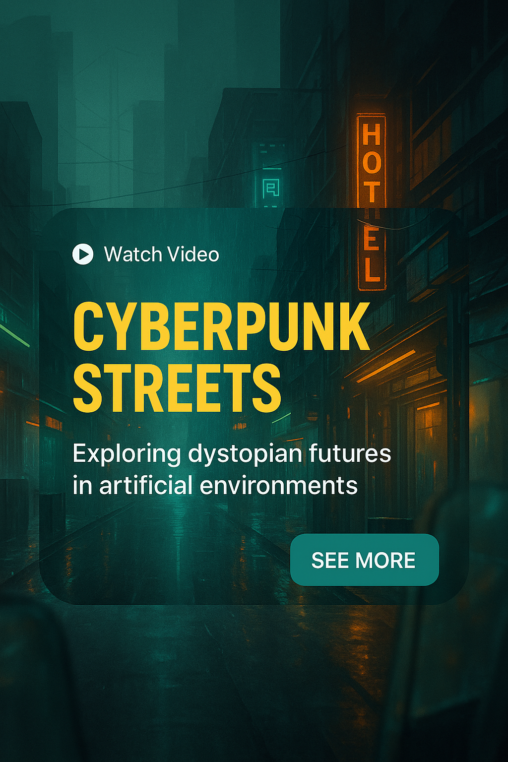 A visually striking promotional image showcasing a cyberpunk street scene with neon lighting and moody atmosphere, designed to attract viewers to explore dystopian themes in video content.