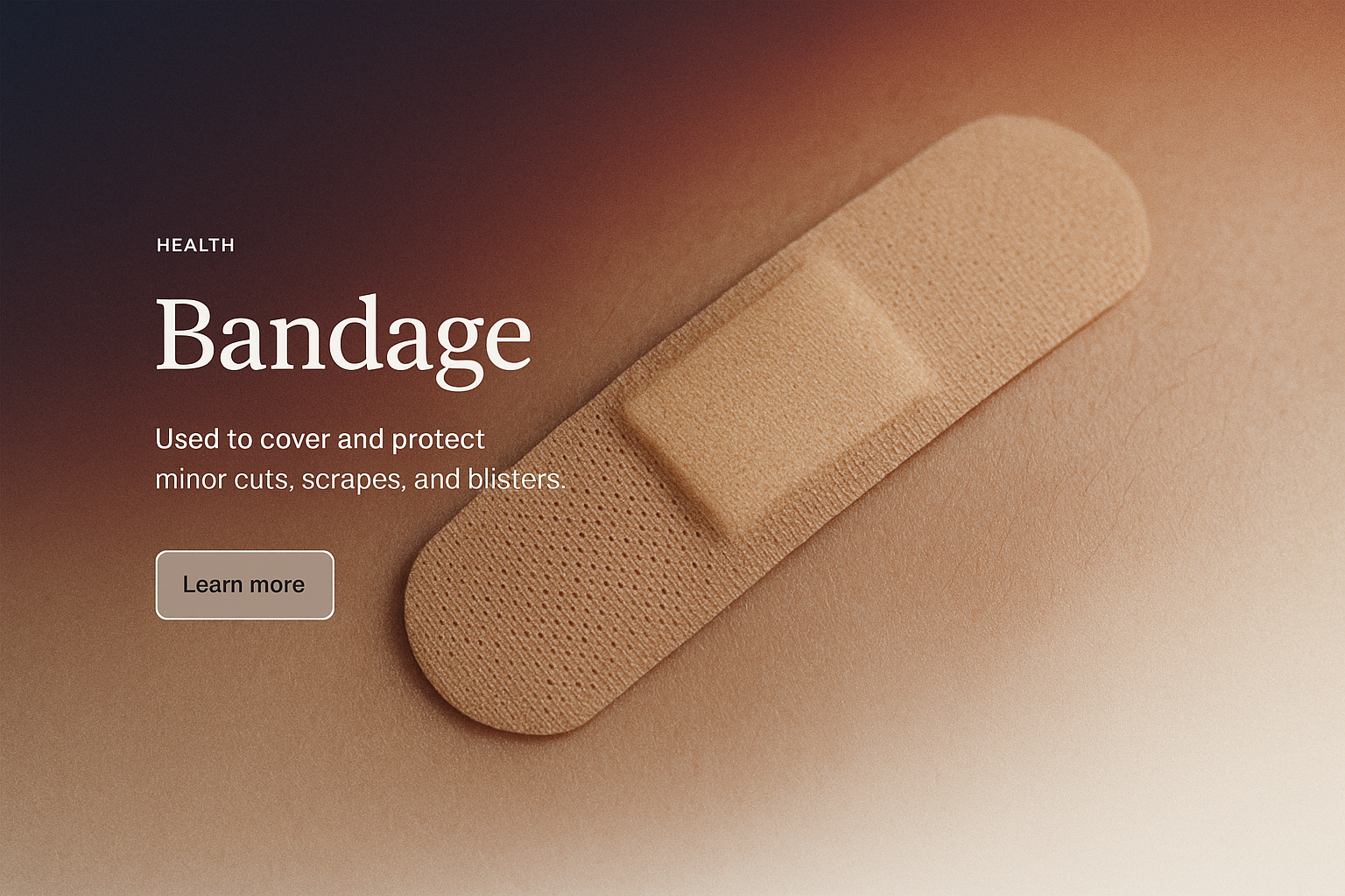 A stylish web page showcasing a bandage on a gradient background. It includes a small label, a brief description, and a call-to-action button.