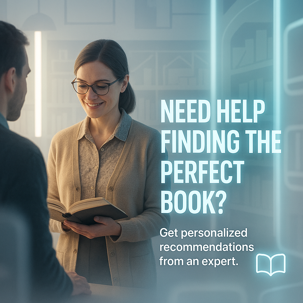 Promotional image for a book recommendation service featuring a friendly interaction between a customer and an expert, designed for social media use.