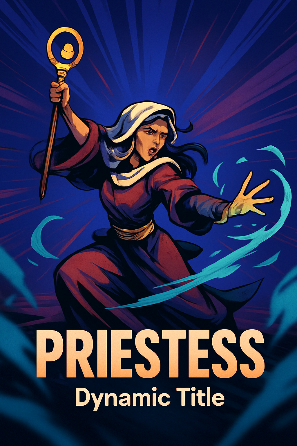 A striking illustration of a powerful priestess in action, wielding a staff and casting dynamic energy waves, set against a vibrant gradient background.