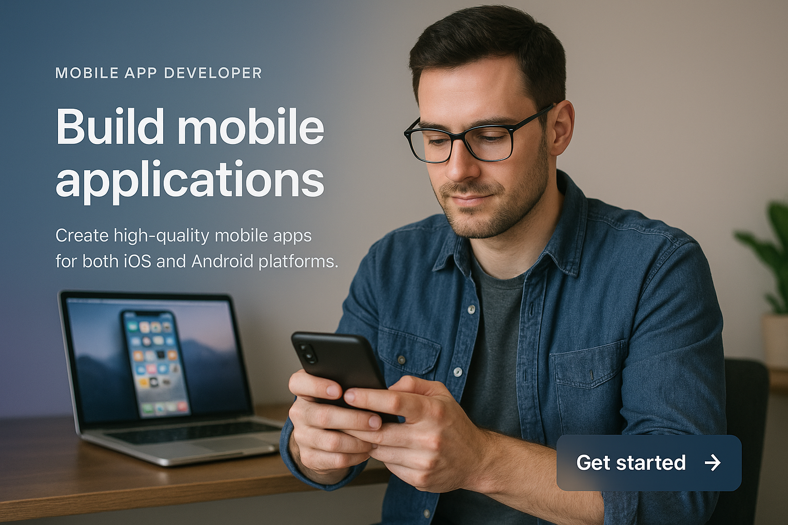/Collection: /by davooda/Type: PNG/A mobile app developer focused on creating high-quality applications for iOS and Android. The scene features a stylish workspace with a laptop and a developer engaged with a smartphone.
