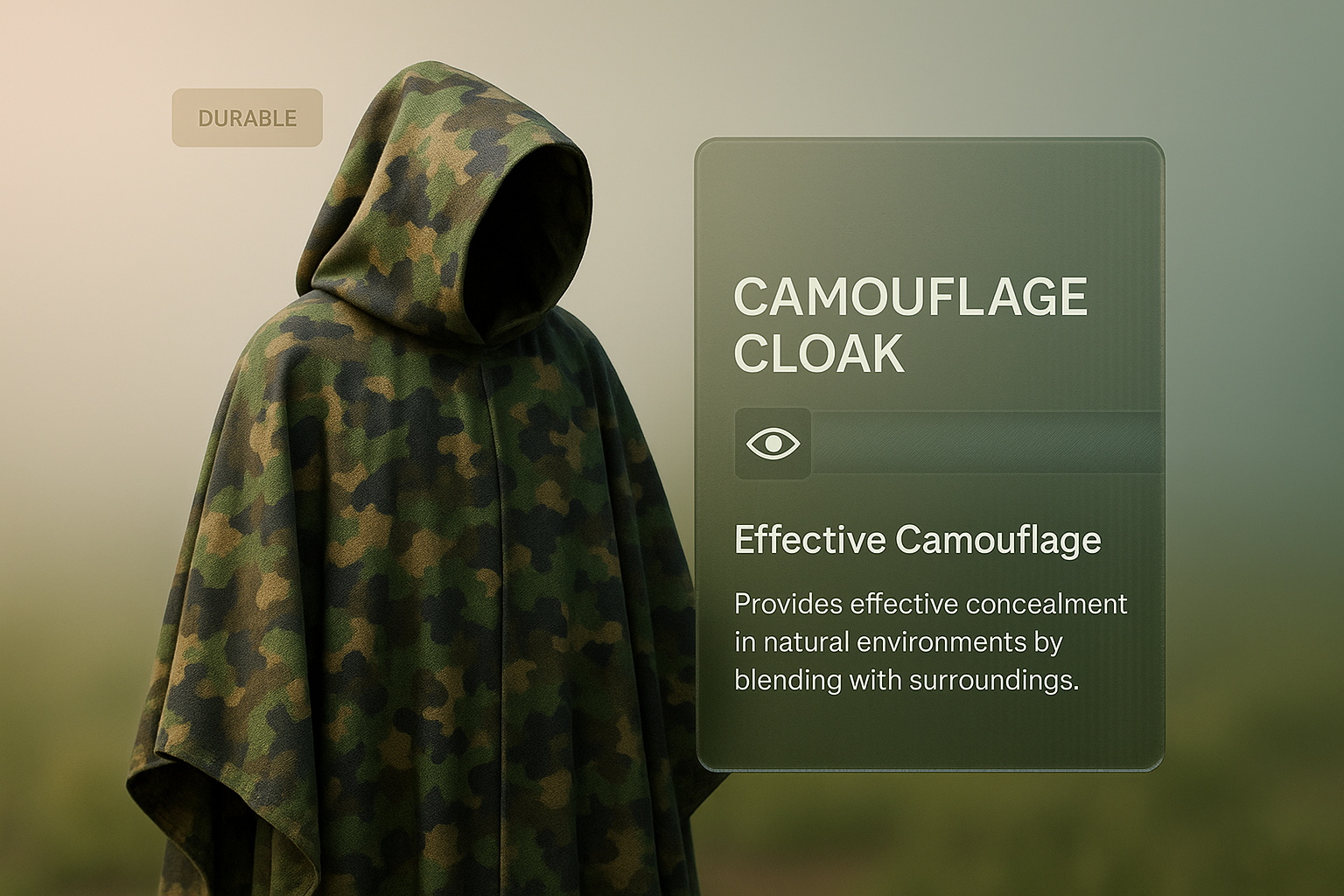 /Collection: /by davooda/Type: PNG/A 3D illustration of a camouflage cloak, featuring an integrated text block with a modern design. The cloak blends seamlessly into a natural setting, showcasing effective concealment.