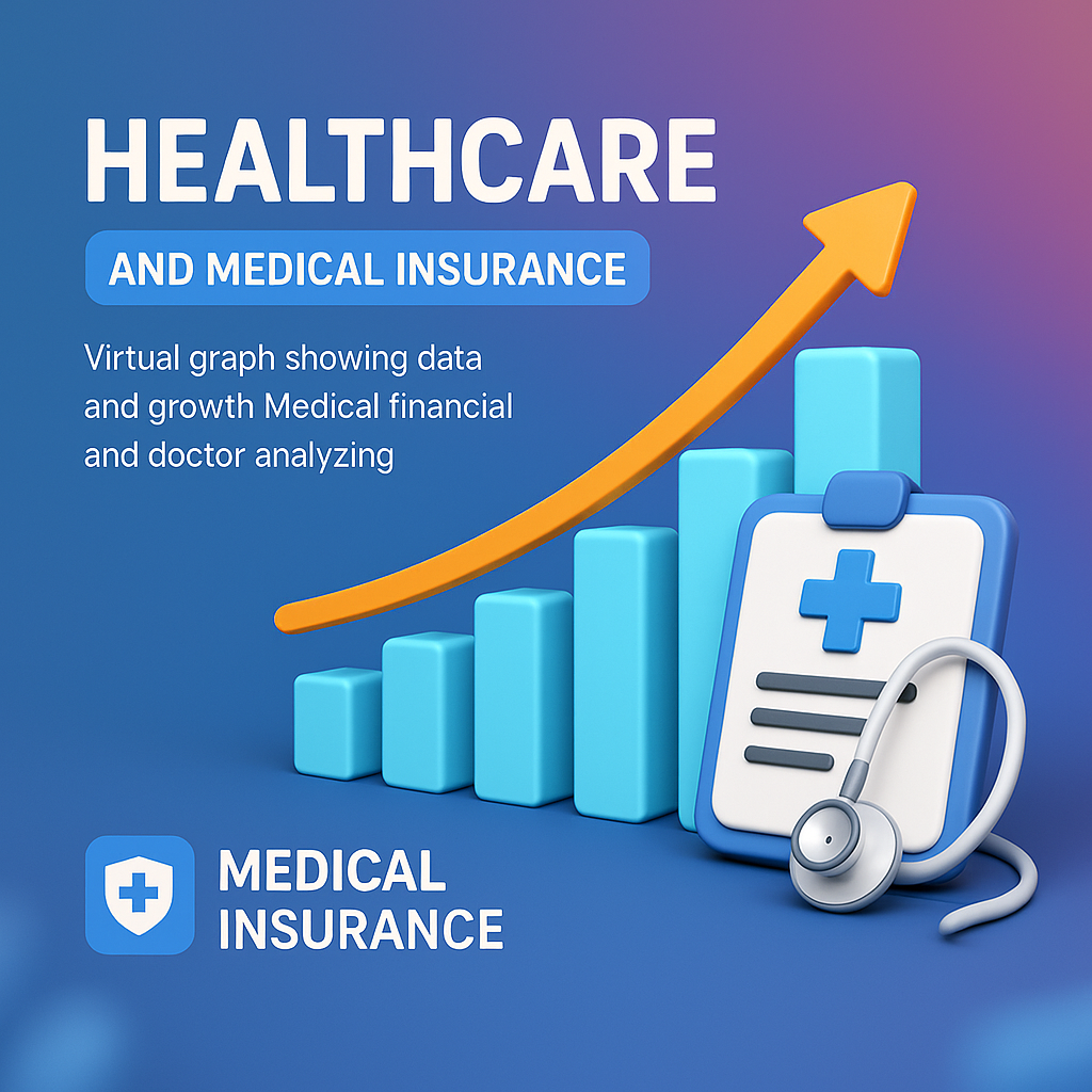 /Collection: /by davooda/Type: PNG/This is a 3D infographic showcasing healthcare and medical insurance data, featuring a growth graph, a medical chart, and a stethoscope. Designed for informative presentations.