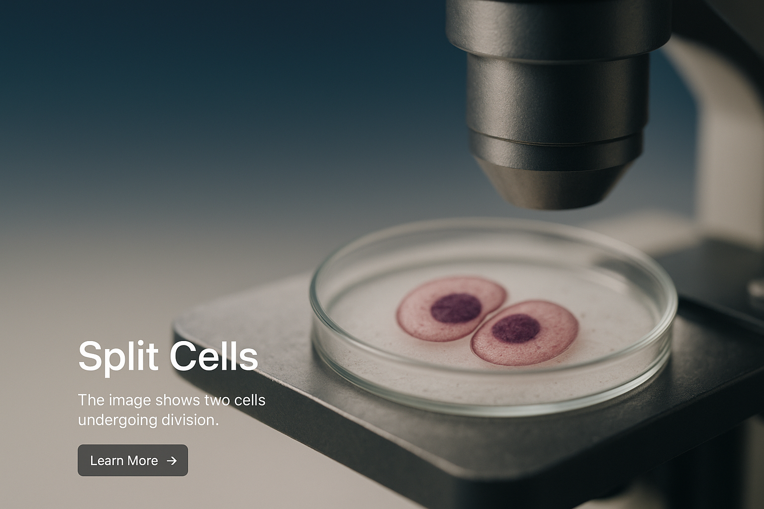 A mockup of a web page featuring a microscope image of split cells on a gradient background. It includes a small label, a concise header, a text block, and an action button.