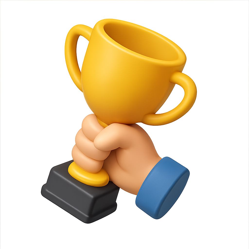 A vibrant 3D trophy held by a hand, featuring a golden cup and a black base. The design showcases a three-quarter isometric view with a volumetric feel.