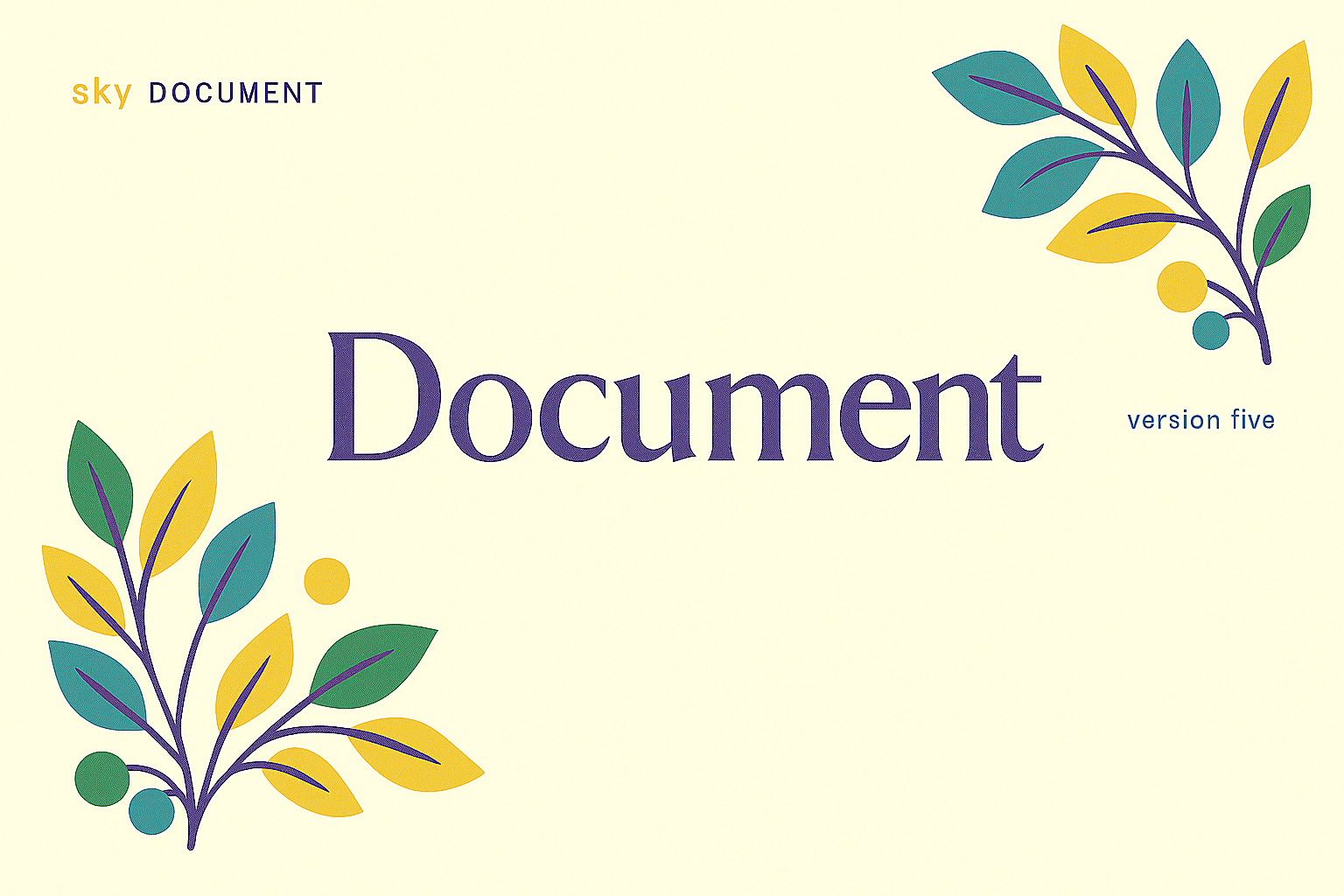 An artistic design featuring vibrant three-color patterns with stylized leaves in green, yellow, and purple against a light background.