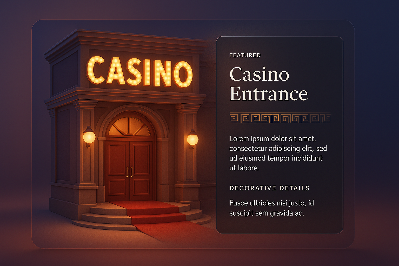 A captivating 3D illustration of a casino entrance featuring bright signage and a red carpet. The design includes decorative details and a dark overlay for text integration.