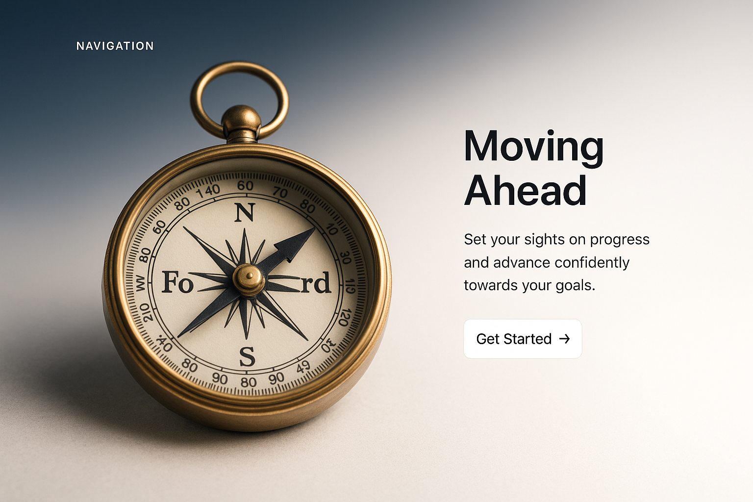 A beautifully designed compass indicating 'Moving Ahead' with a clean layout. Features a gradient background and a call-to-action button, ideal for web use.
