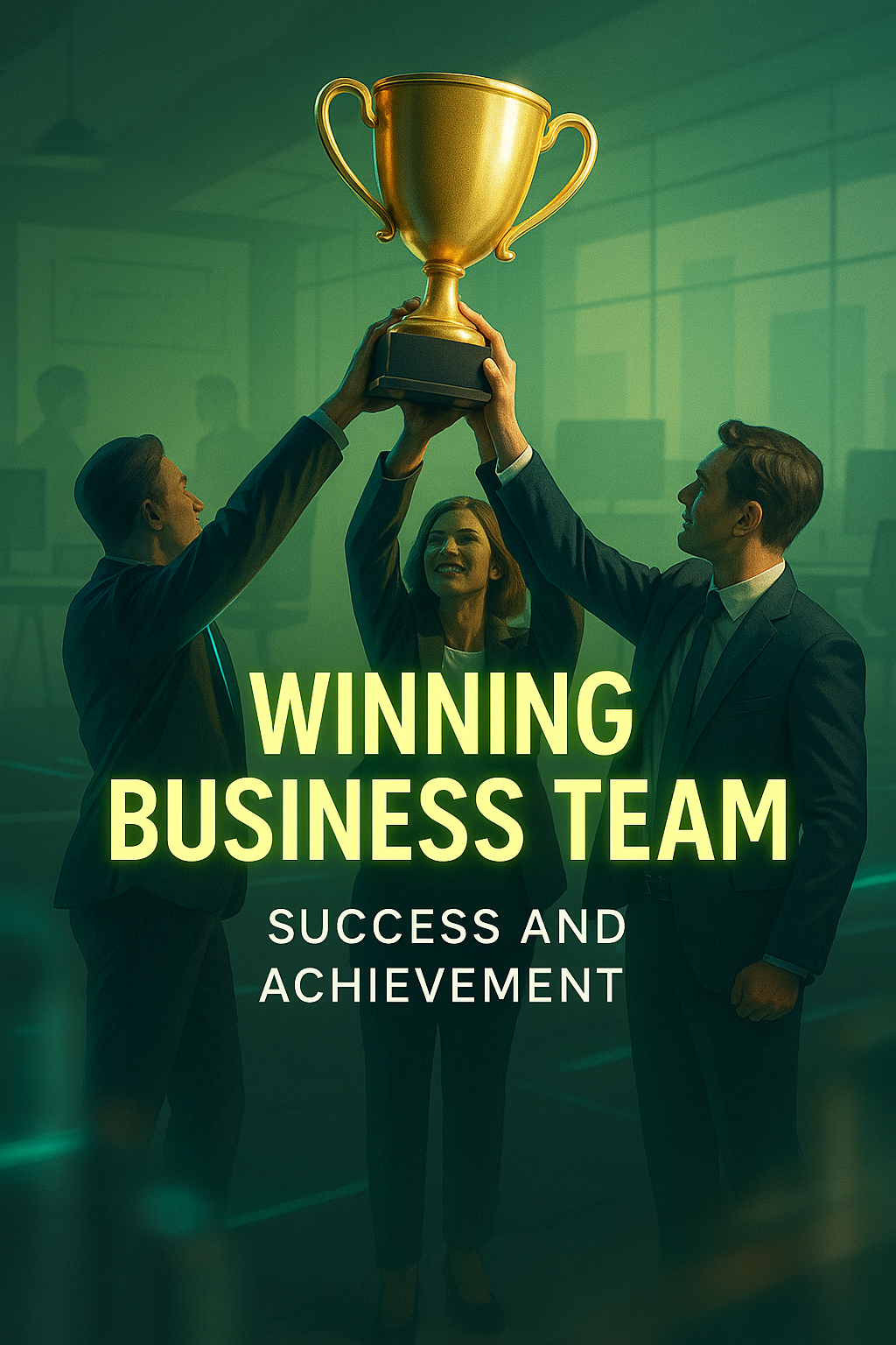 /Collection: /by davooda/Type: PNG/A motivational image depicting a business team celebrating a trophy, symbolizing success and achievement. The modern design and color palette aim to inspire professionals and teams in corporate settings.
