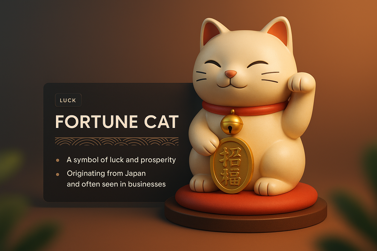 /Collection: /by davooda/Type: PNG/A 3D illustration of a fortune cat statue, commonly known as Maneki-neko, featuring a friendly expression, raised paw, and a bell. The design integrates a dark banner with informative text.
