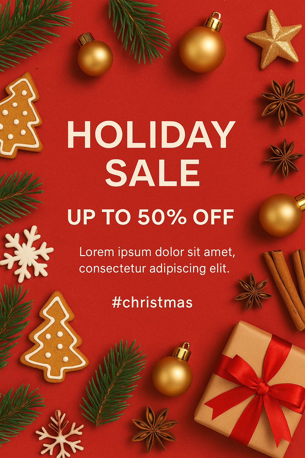 Vibrant promotional image for a holiday sale featuring festive decorations like ornaments, gingerbread cookies, and a gift box, ideal for social media marketing.
