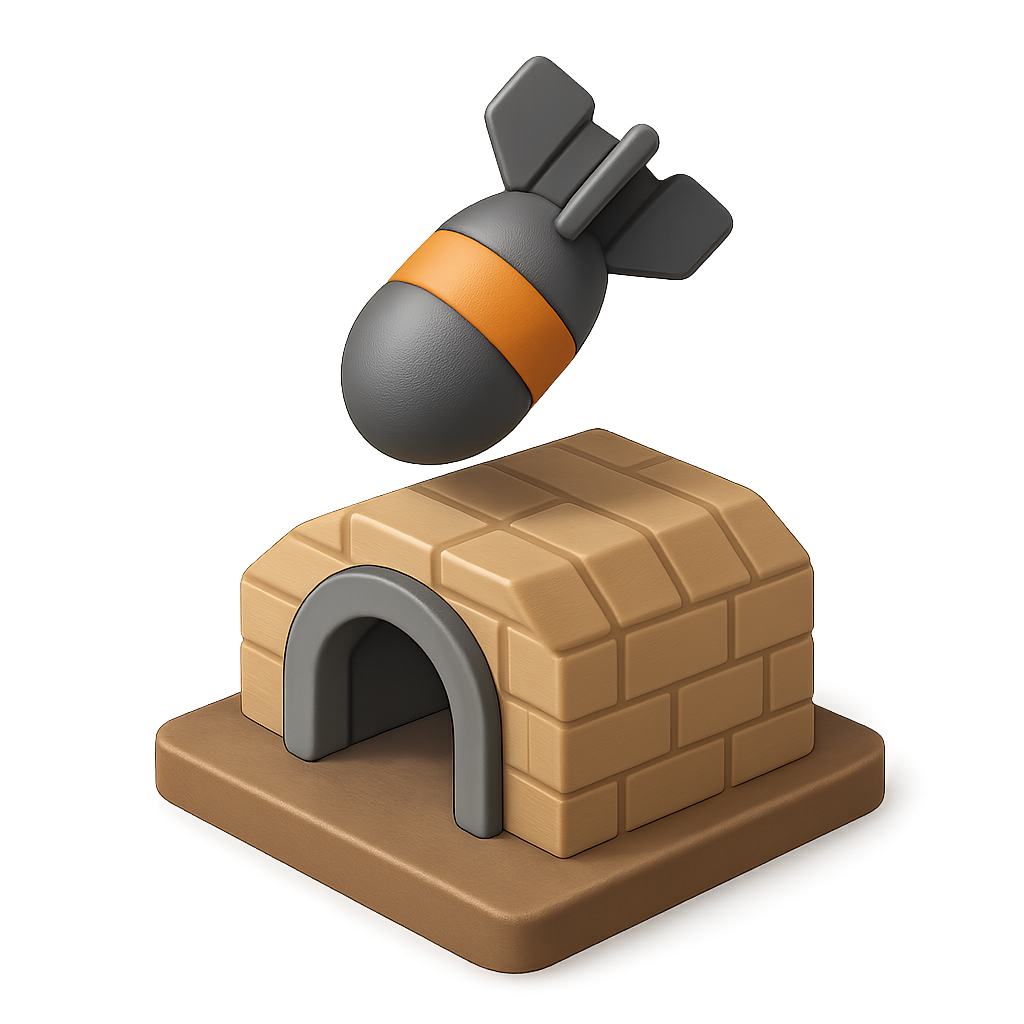/Collection: /by davooda/Type: PNG/A 3D icon depicting a bomb shelter with a bomb hovering above it. The shelter features a brick design and is set against a gradient background, enhancing its volumetric appearance.