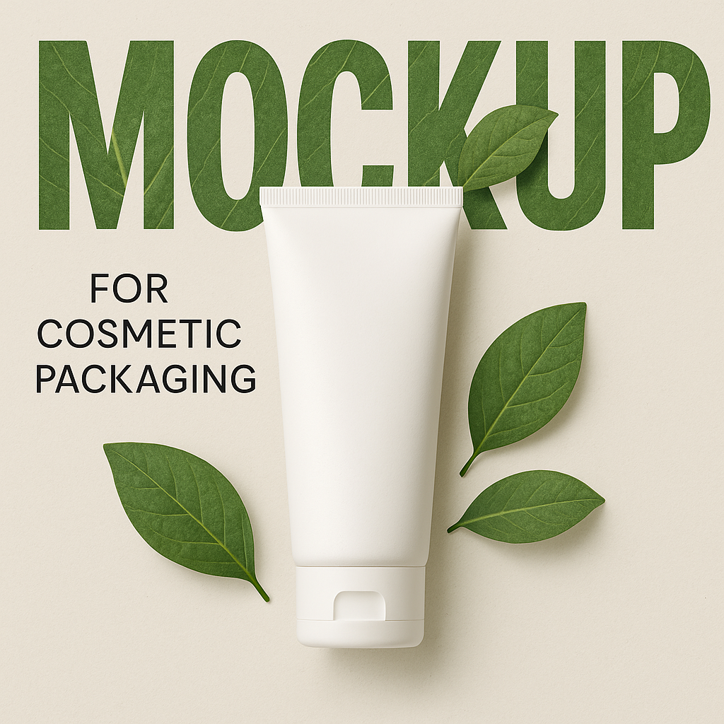 Professional mockup featuring a blank cosmetic tube surrounded by green leaves, ideal for showcasing packaging designs in beauty marketing.