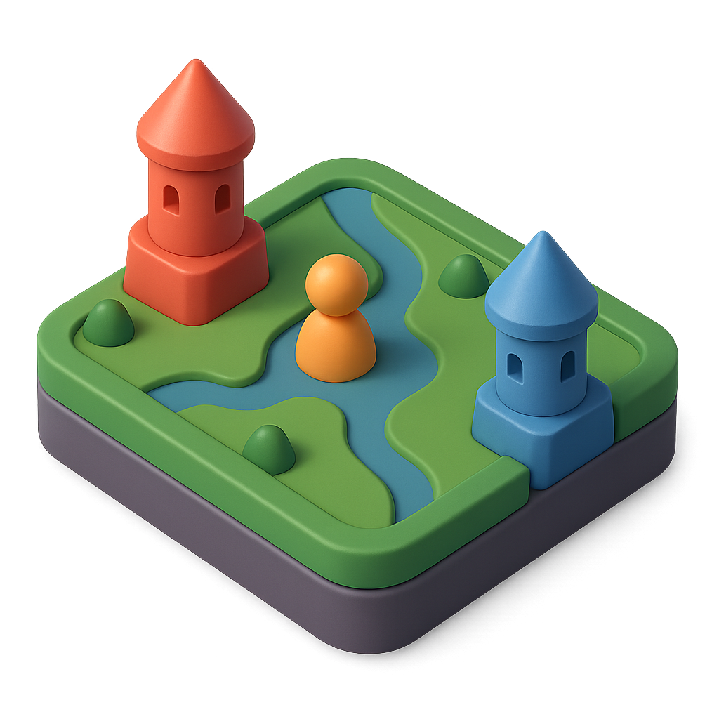 A vibrant 3D icon depicting a game board with two colorful towers and a central pawn on a green landscape, featuring a river running through it.