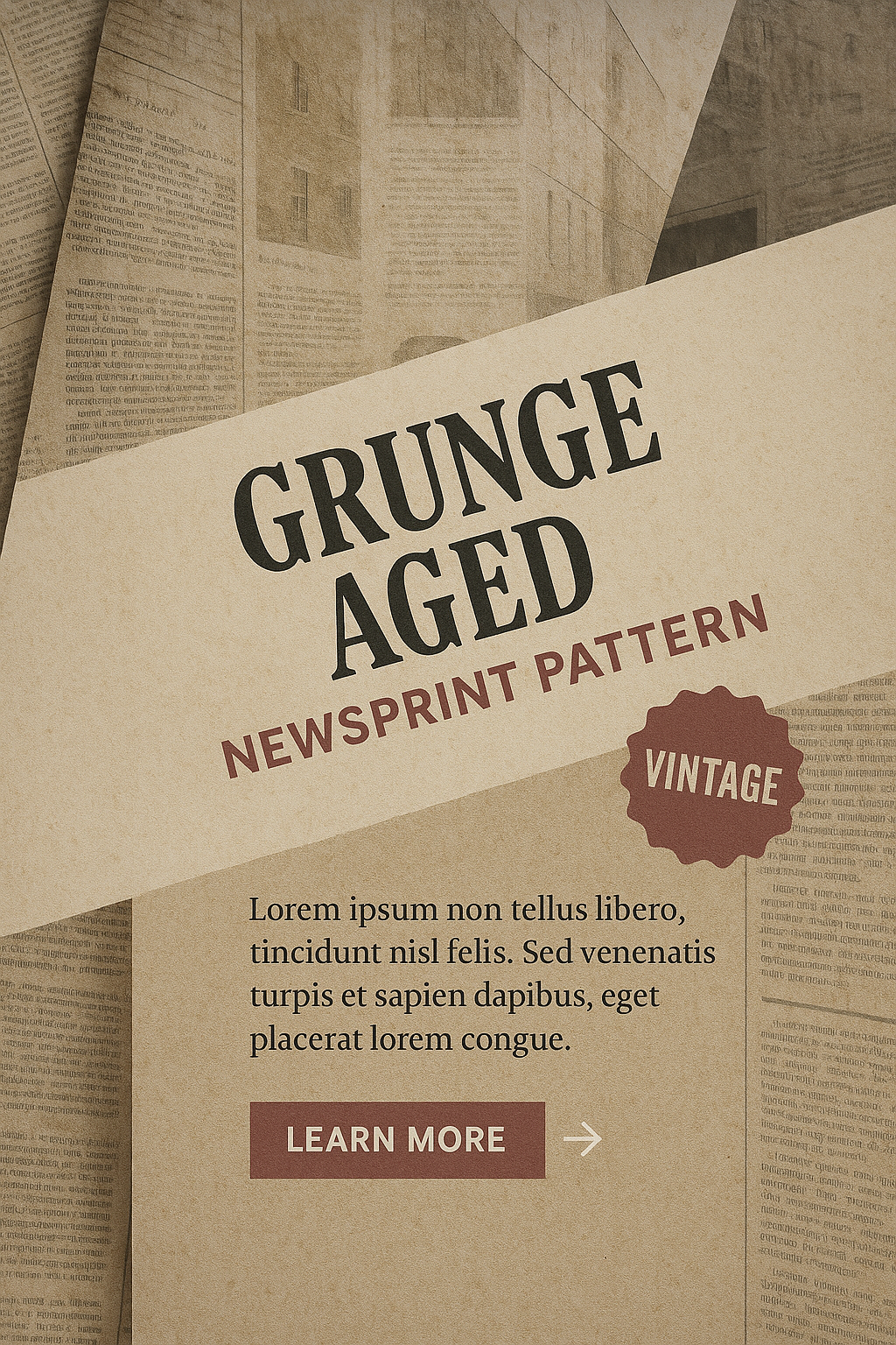 A realistic collage of grunge aged newspaper patterns, featuring a vintage aesthetic with layered text elements and a 'Learn More' action button, ideal for a professional design.
