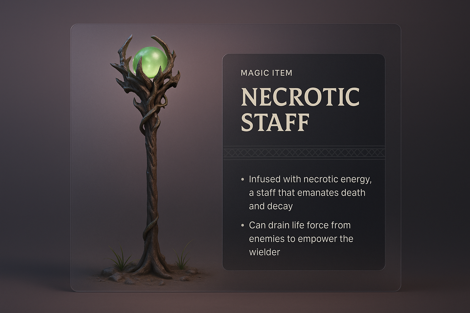 /Collection: /by davooda/Type: PNG/A visually striking 3D illustration of a necrotic staff featuring a glowing green orb. The design includes integrated text elements and a dark translucent panel, creating a mystical appearance.